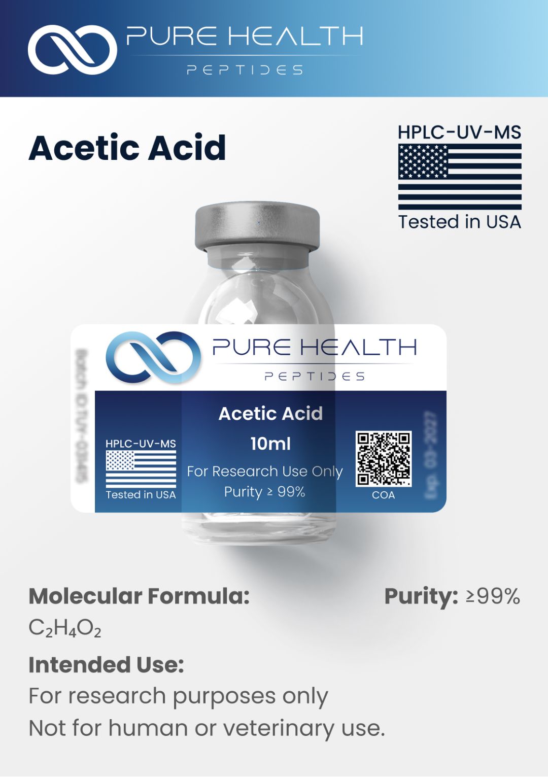 Acetic Acid is a simple organic carboxylic acid commonly used in laboratory and research environments as a chemical reagent, solvent component, and pH-adjusting agent. It is a clear, colorless liquid with a characteristic odor and high miscibility in water and many organic solvents. Acetic acid is produced through chemical synthesis and supplied as a liquid research material. This product is intended exclusively for controlled in vitro research applications conducted by qualified professionals and is not formulated for clinical, diagnostic, or therapeutic use.