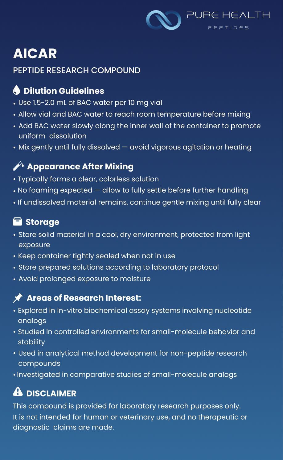 AICAR is a synthetic nucleotide analog commonly used as a reference compound in laboratory research involving cellular and biochemical assay systems. It is not a peptide and is produced via chemical synthesis rather than amino acid assembly.