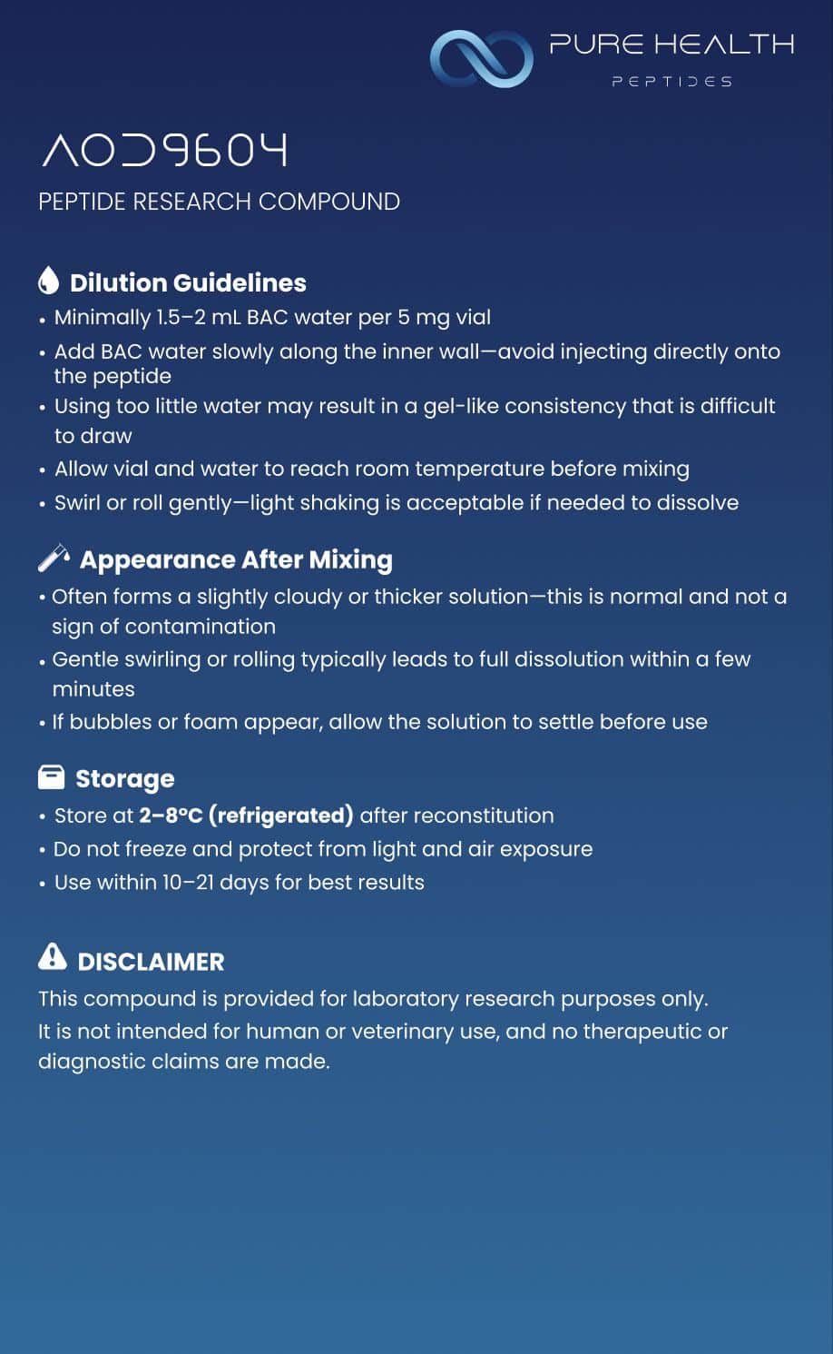 AOD9604 is a synthetic peptide analog derived from the C-terminal region (176–191) of human growth hormone (HGH), consisting of a defined amino acid sequence produced through controlled peptide synthesis. The compound incorporates structural modifications relative to the native fragment and is not identical to endogenous HGH or its naturally occurring derivatives. It is structurally characterized and utilized in laboratory research settings for analytical and experimental evaluation under controlled conditions. The compound is supplied in lyophilized powder form to support stability and integrity during storage and handling in research environments. No therapeutic, diagnostic, or clinical claims are made or implied.