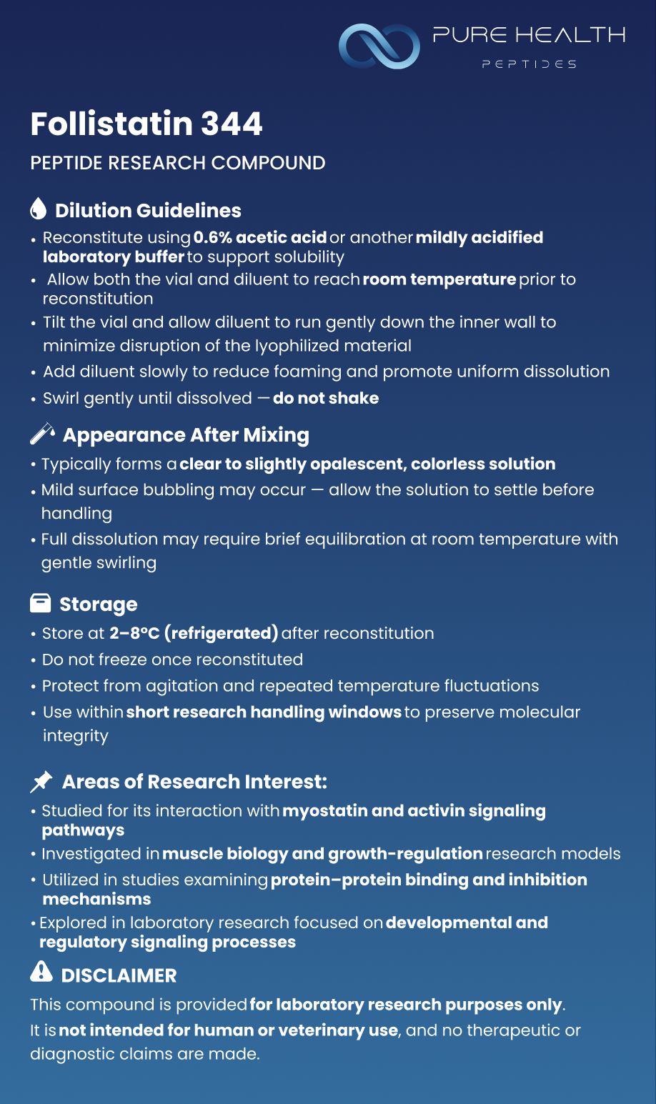 Supplied as a lyophilized powder, Follistatin 344 is intended strictly for controlled in-vitro laboratory research and analytical applications. It is not designed for clinical, diagnostic, or therapeutic use.