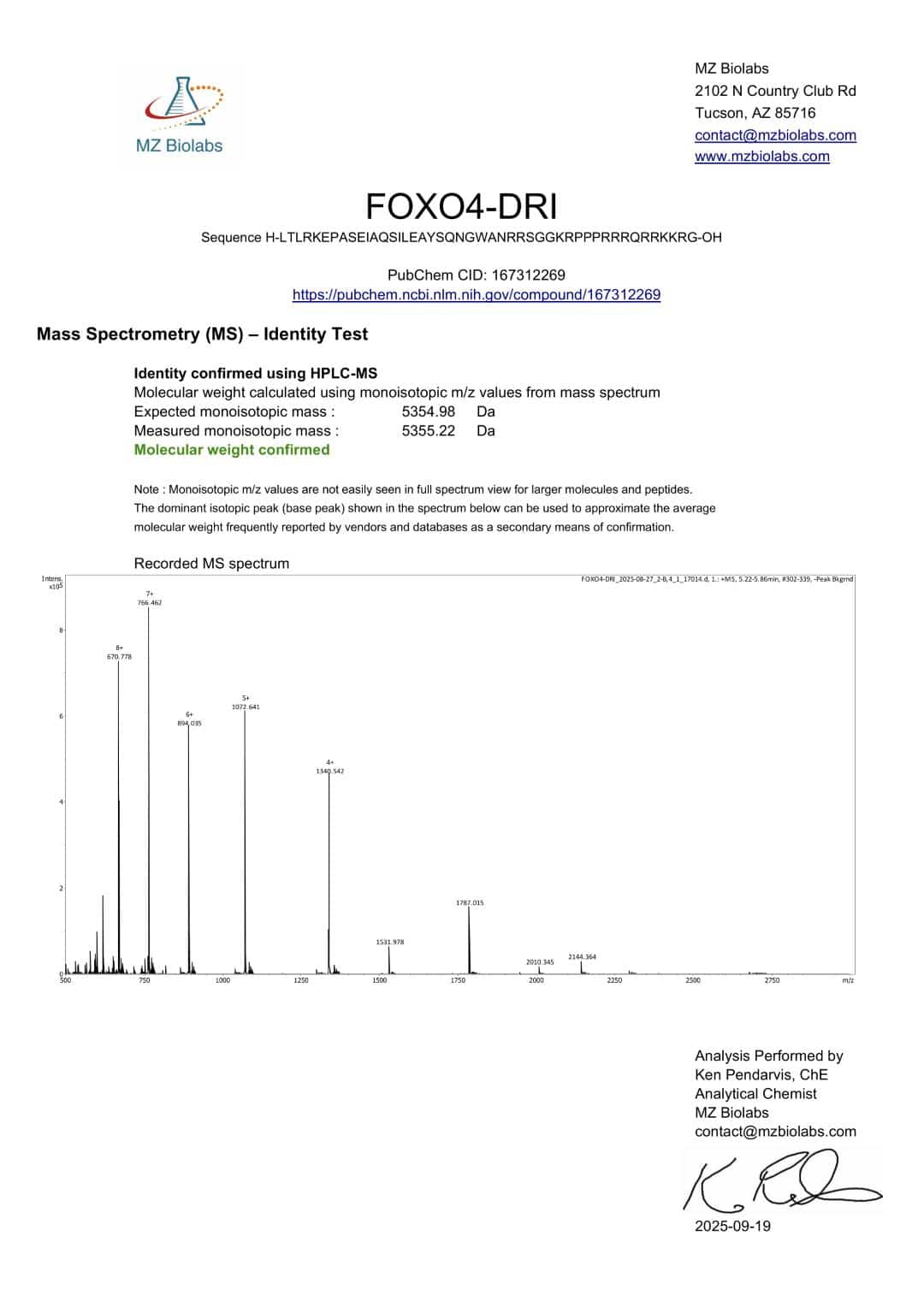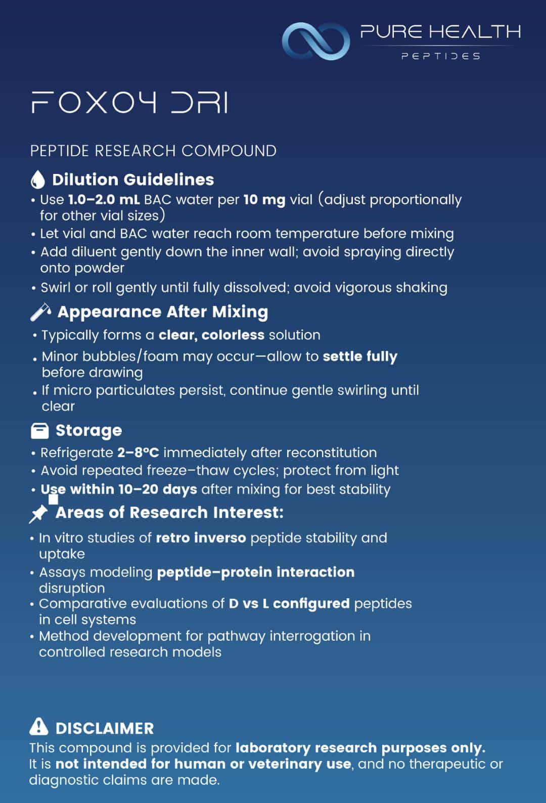 FOXO4-DRI is a synthetic peptide engineered in a D-retro-inverso configuration based on a FOXO4 interaction domain. The retro-inverso design and D-residue composition are used in research to study peptide stability and target-interaction modeling in vitro. Supplied as a lyophilized powder, FOXO4-DRI is intended strictly for controlled laboratory research.