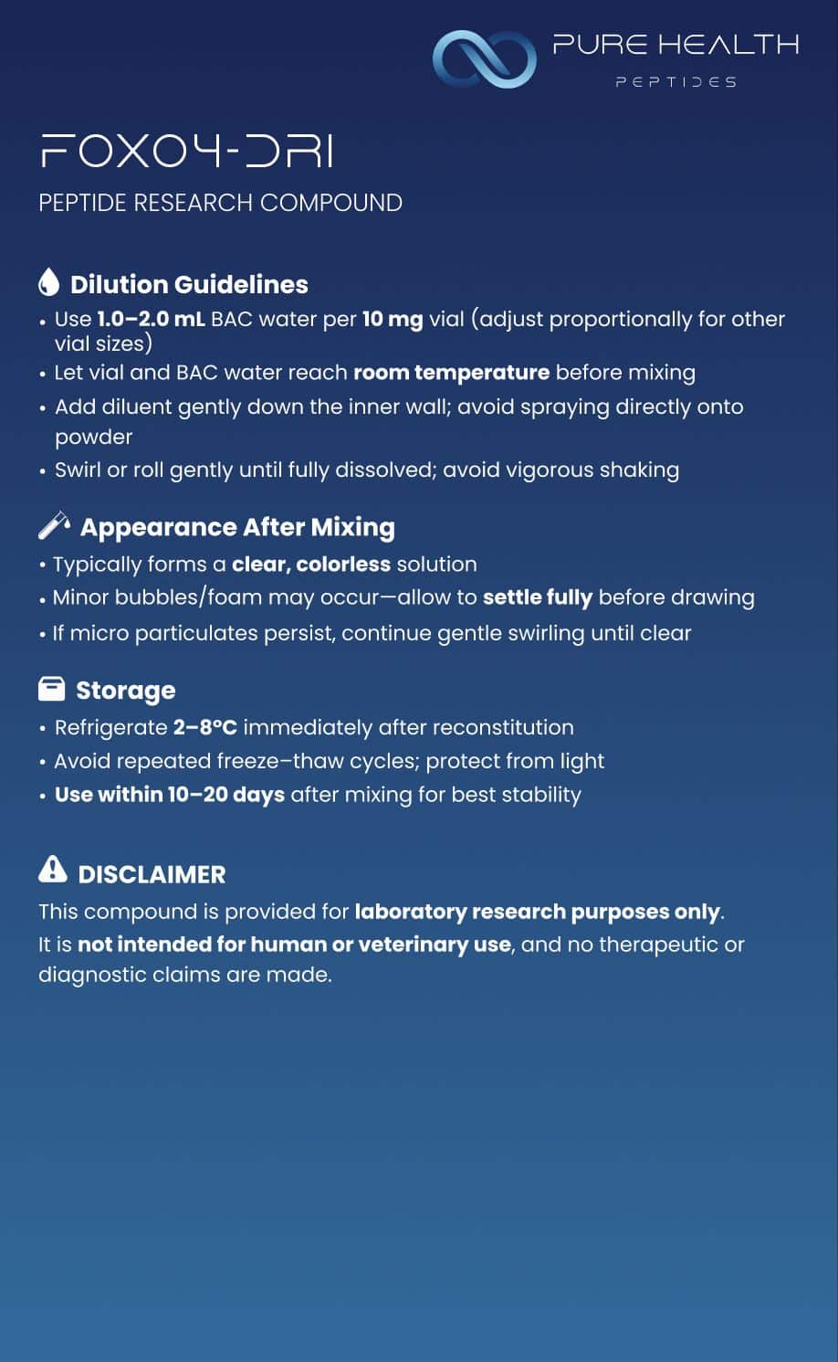 This product is not a drug, food, cosmetic, or dietary supplement and has not been evaluated by the FDA. It is strictly intended for in vitro research by qualified professionals. Any use in humans or animals is strictly prohibited and may violate federal, state, or local laws, including the Federal Food, Drug, and Cosmetic Act. No therapeutic or diagnostic application is implied or permitted. The purchaser assumes all responsibility for compliance with applicable regulations. By purchasing this product, the buyer represents and warrants that it will be used solely for in vitro research purposes and acknowledges that Pure Health Peptides maintains internal policies intended to support research-use-only sales.