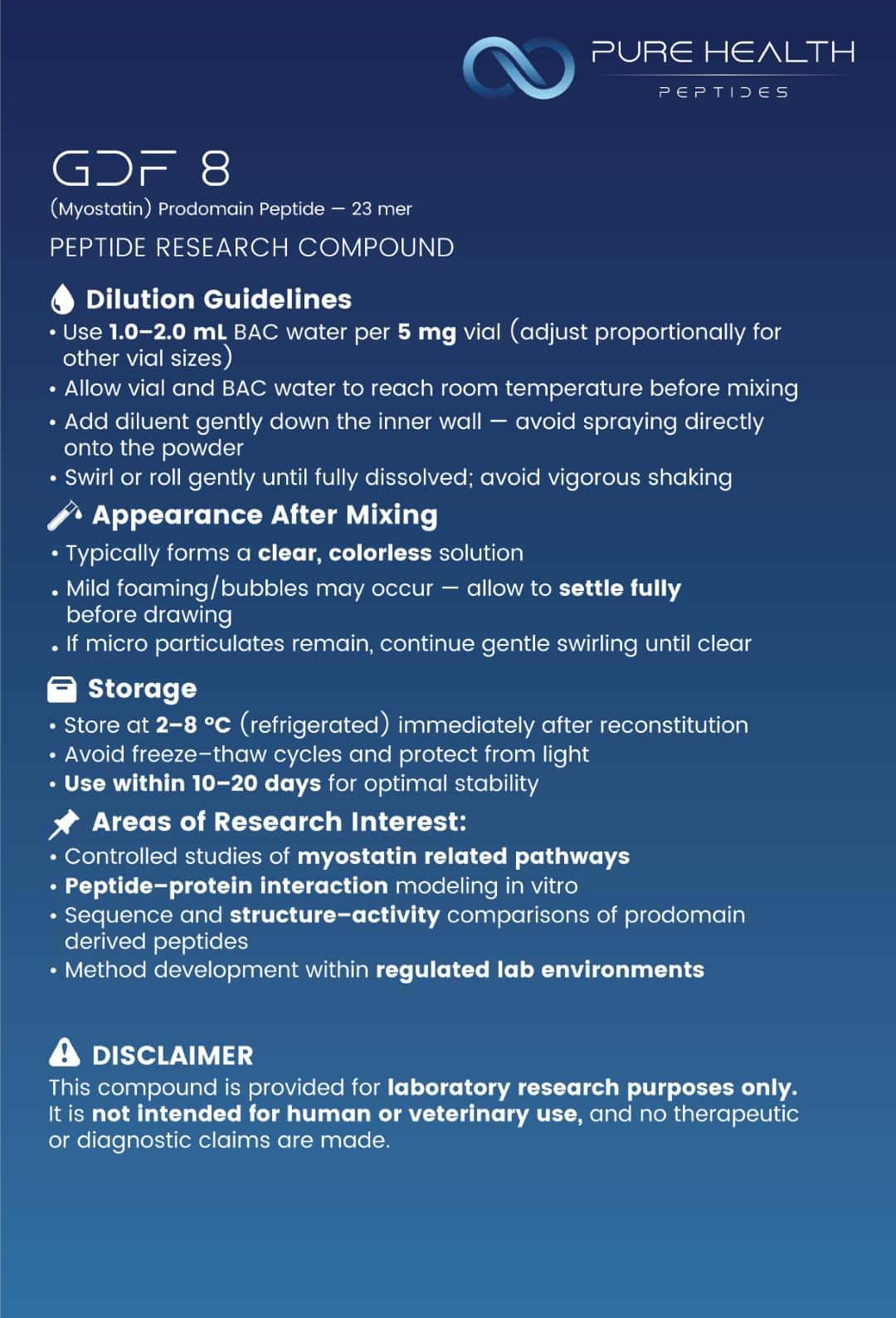 GDF-8 (Myostatin) Prodomain Peptide is FOR RESEARCH USE ONLY. It is not intended for human or veterinary use. This product has not been evaluated by the FDA. Any misuse may violate federal, state, or local laws. By purchasing this product, the buyer represents and warrants that it will be used only for in vitro research purposes.