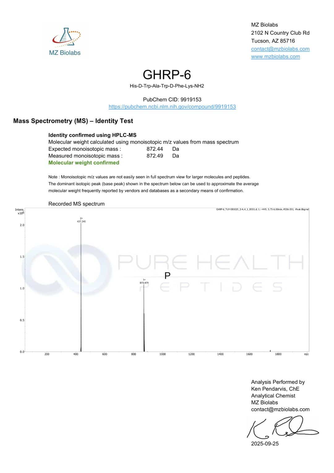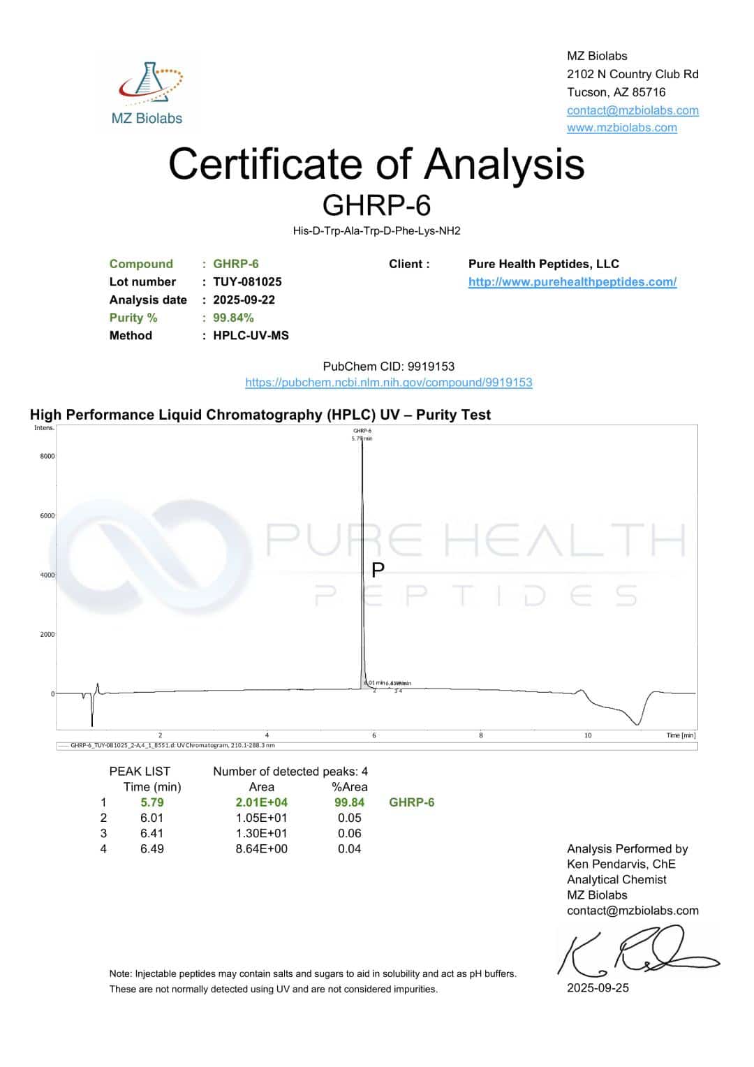 GHPR-6 (Growth Hormone Releasing Peptide-6) is a synthetic hexapeptide known for its ability to stimulate the secretion of growth hormone (GH) by interacting with ghrelin receptors. This peptide has been extensively studied for its role in enhancing anabolic processes, promoting recovery, and supporting energy balance. GHRP-6 is provided in lyophilized powder form for research purposes related to growth hormone regulation, metabolism, and tissue regeneration.