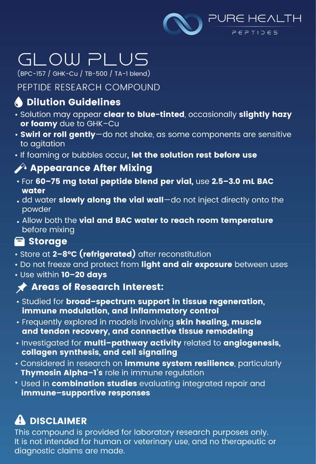 The “GLOW-Plus” Blend takes regenerative peptide research to the next level by incorporating Thymosin Alpha-1 into the proven combination of BPC-157, GHK-Cu, and TB-500. This powerful blend offers a comprehensive research platform for exploring advanced tissue regeneration, immune modulation, and skin health enhancement. Ideal for investigating the synergistic effects of peptides in cellular repair, inflammation reduction, and overall rejuvenation, this blend supports cutting-edge research in regenerative medicine and immunology.