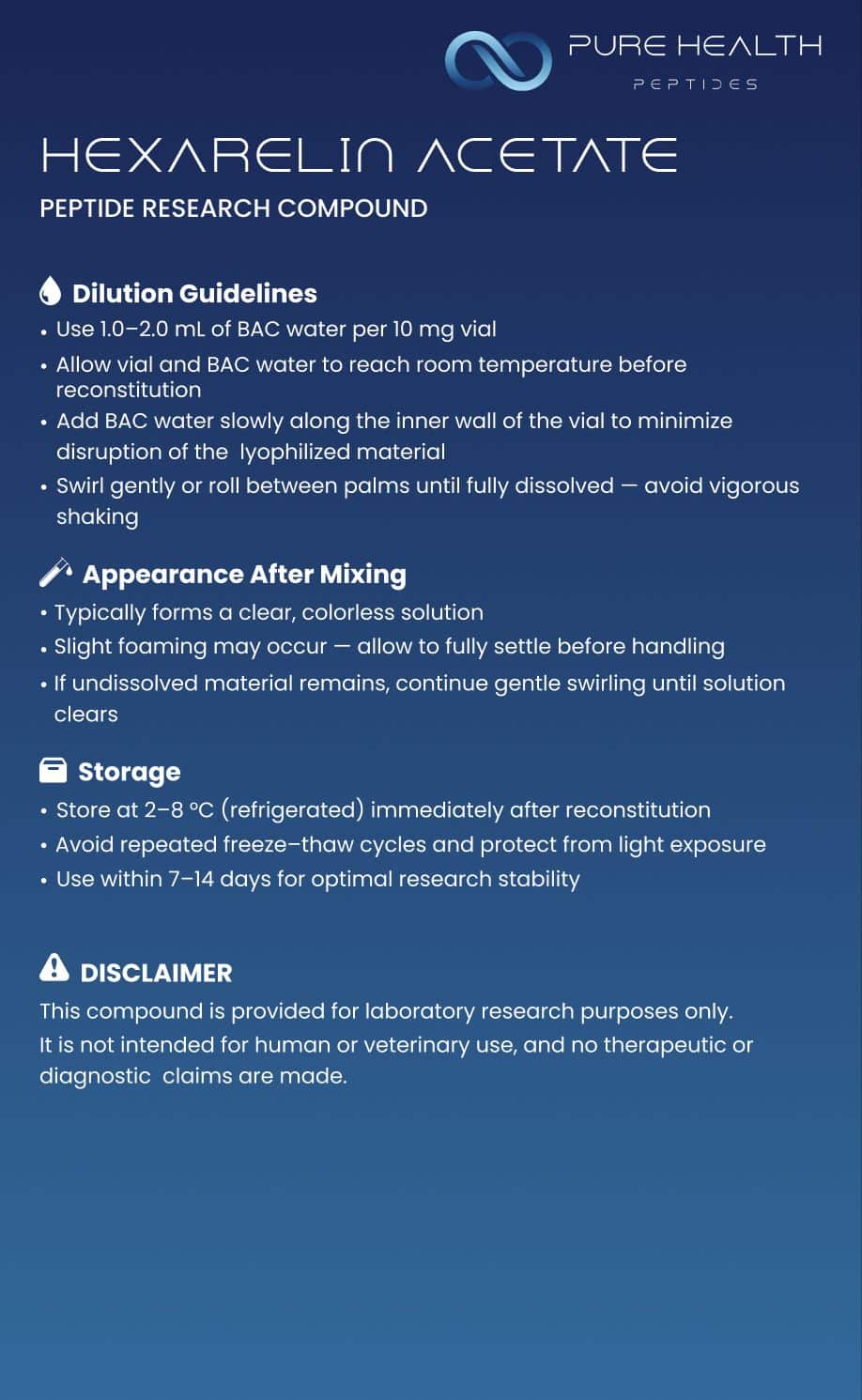 Hexarelin Acetate is a synthetic hexapeptide produced via solid-phase peptide synthesis and supplied as a lyophilized powder. The compound incorporates non-standard amino acid residues and is provided in acetate salt form to support stability and handling in laboratory settings.