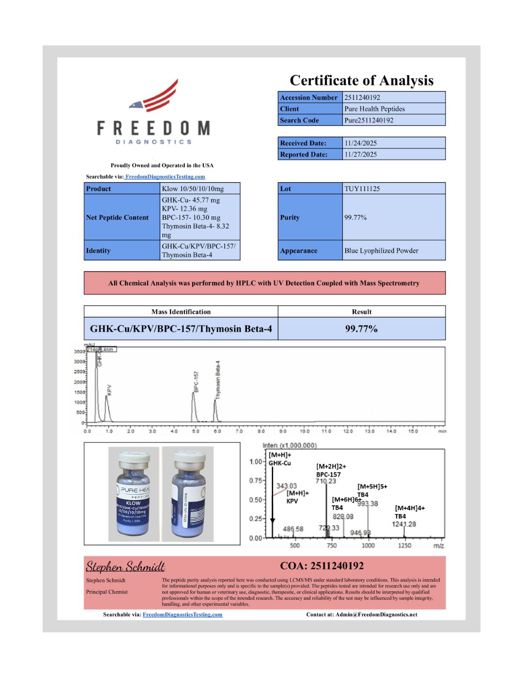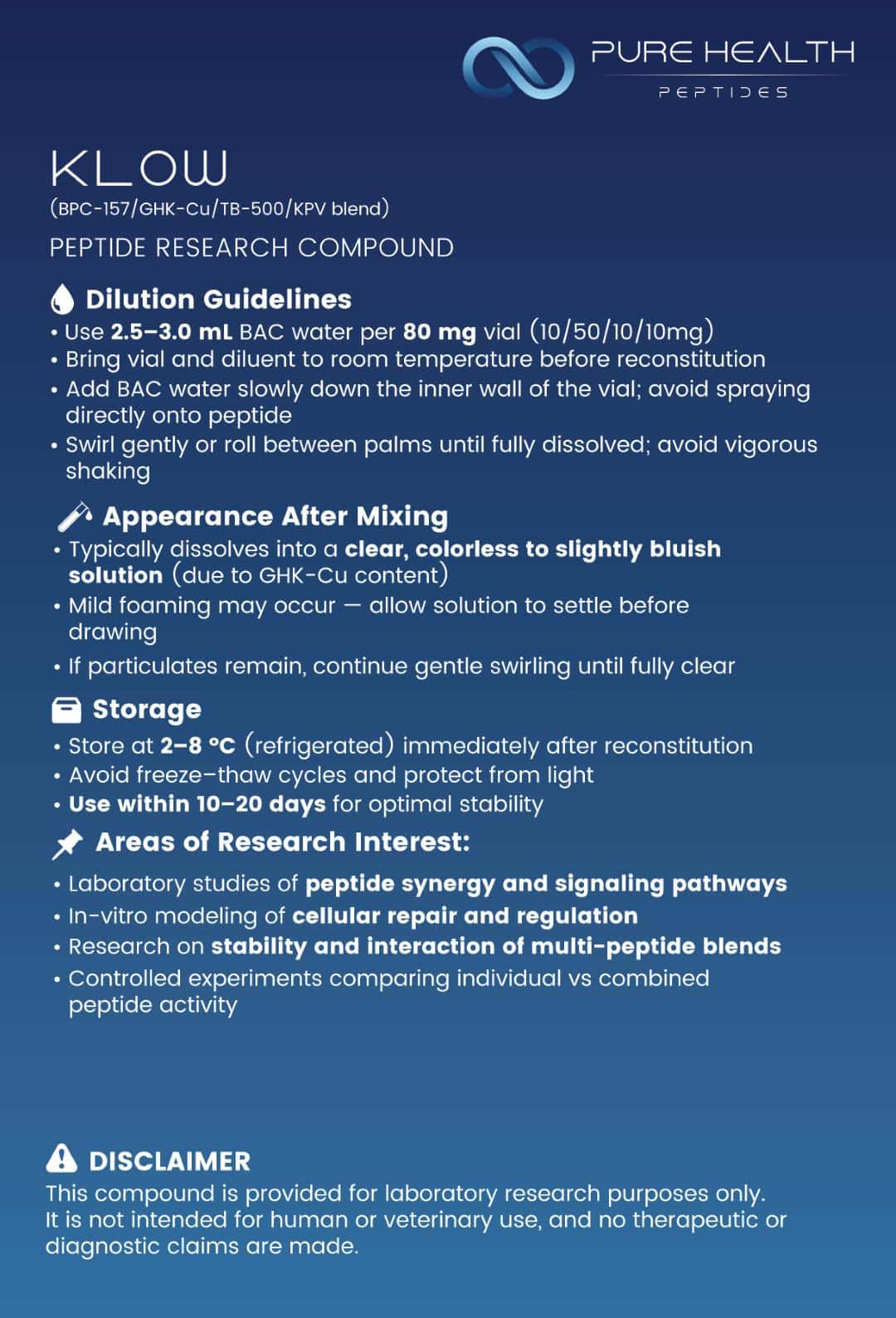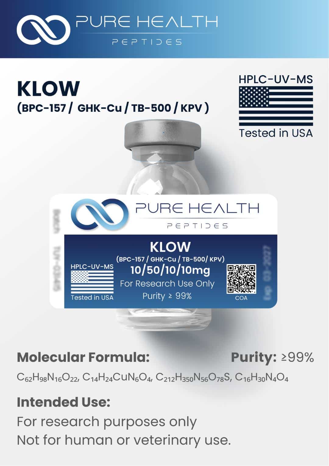 KLOW is a proprietary research peptide blend composed of BPC-157, GHK-Cu, TB-500, and KPV. Each peptide represents a distinct structural and functional class of research compound, combined in lyophilized form for advanced laboratory studies. This blend is supplied exclusively for in vitro use and is intended for qualified research professionals.