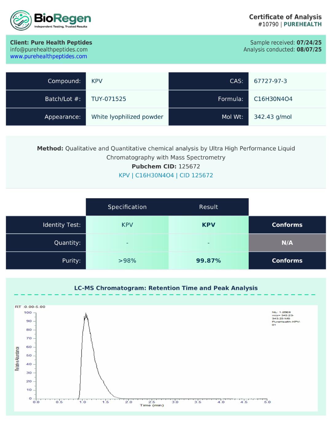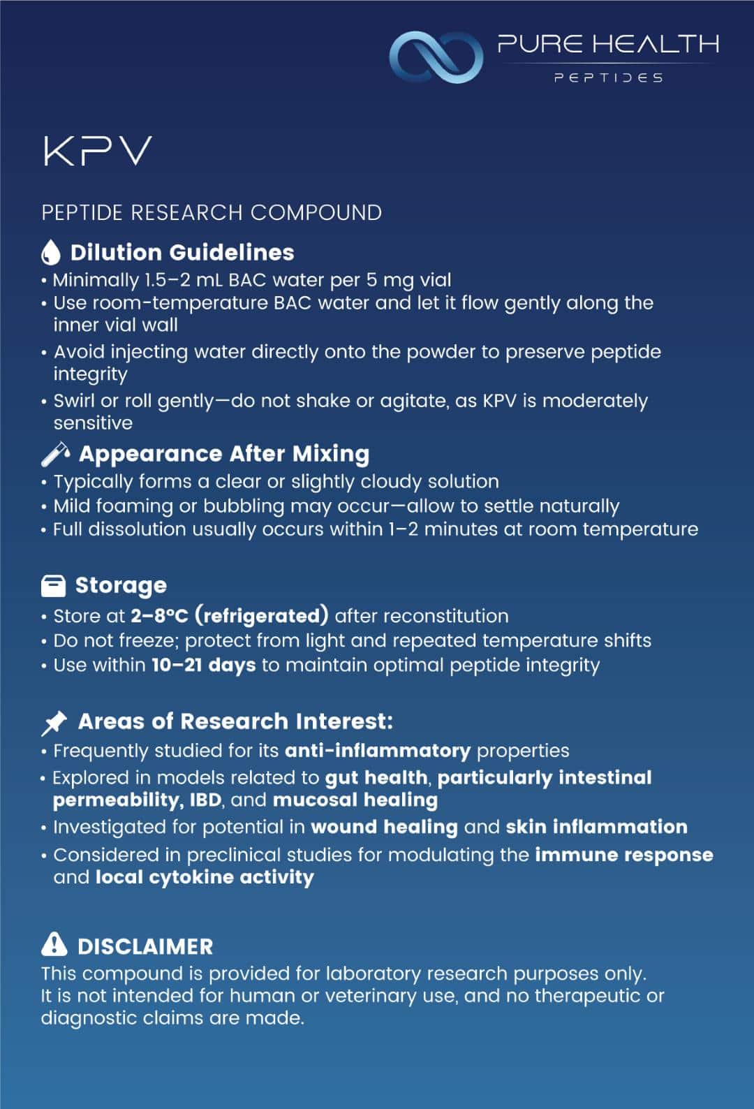 KPV is FOR RESEARCH USE ONLY. Not intended for human or veterinary use. This product has not been evaluated by the FDA. Any unauthorized use may violate federal, state, or local laws. By purchasing, the buyer affirms use solely for in vitro research purposes.