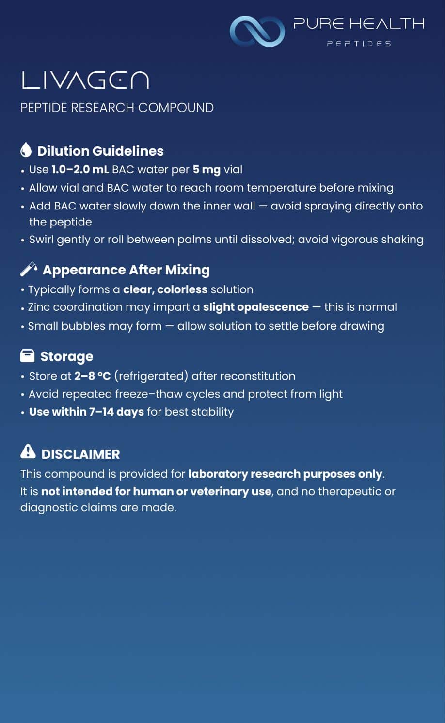 Livagen is a synthetic tetrapeptide complex containing lysine, glycine, aspartic acid, and alanine, stabilized in the presence of zinc. It is provided in lyophilized powder form to ensure high purity and stability for laboratory use. Livagen is intended exclusively for in vitro studies by qualified research professionals investigating peptide–metal interactions and peptide-based research models.