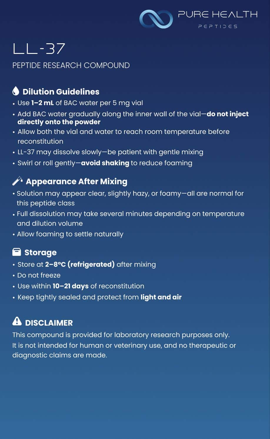 LL-37 is a synthetic peptide corresponding to a sequence derived from the human cathelicidin protein family. It is commonly utilized in biochemical and molecular research involving peptide-mediated signaling and interaction dynamics. In controlled laboratory settings, LL-37 is studied for its role in peptide–membrane interactions, signaling pathway analysis, and structure-function characterization under defined in vitro conditions. This material is supplied in lyophilized powder form and is intended strictly for in vitro research and analytical applications.