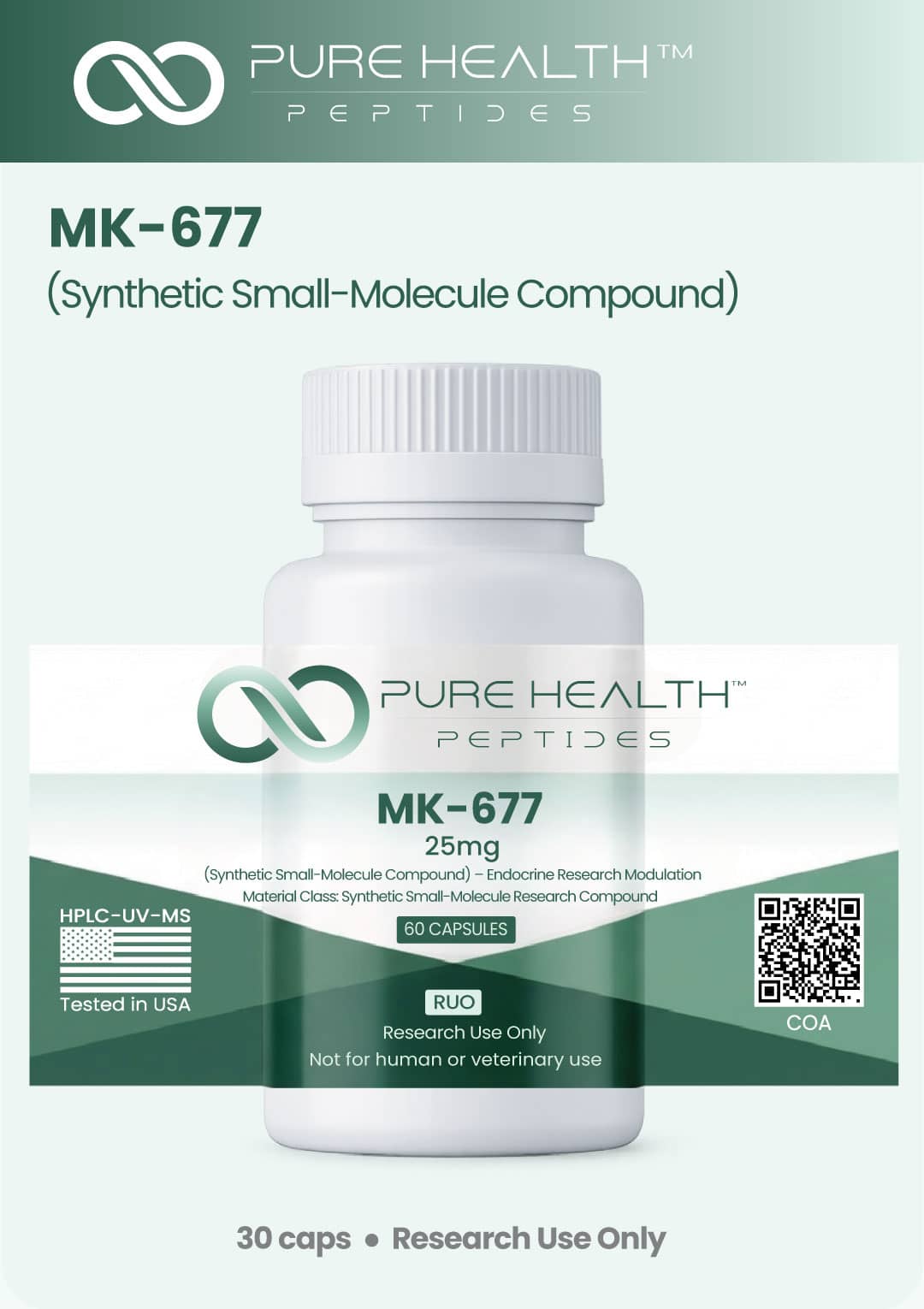 MK-677 (Ibutamoren) is a synthetic small-molecule compound produced via chemical synthesis and supplied as a solid research material. This product is provided in an encapsulated solid format to support controlled storage, handling, and analytical preparation within laboratory research environments.