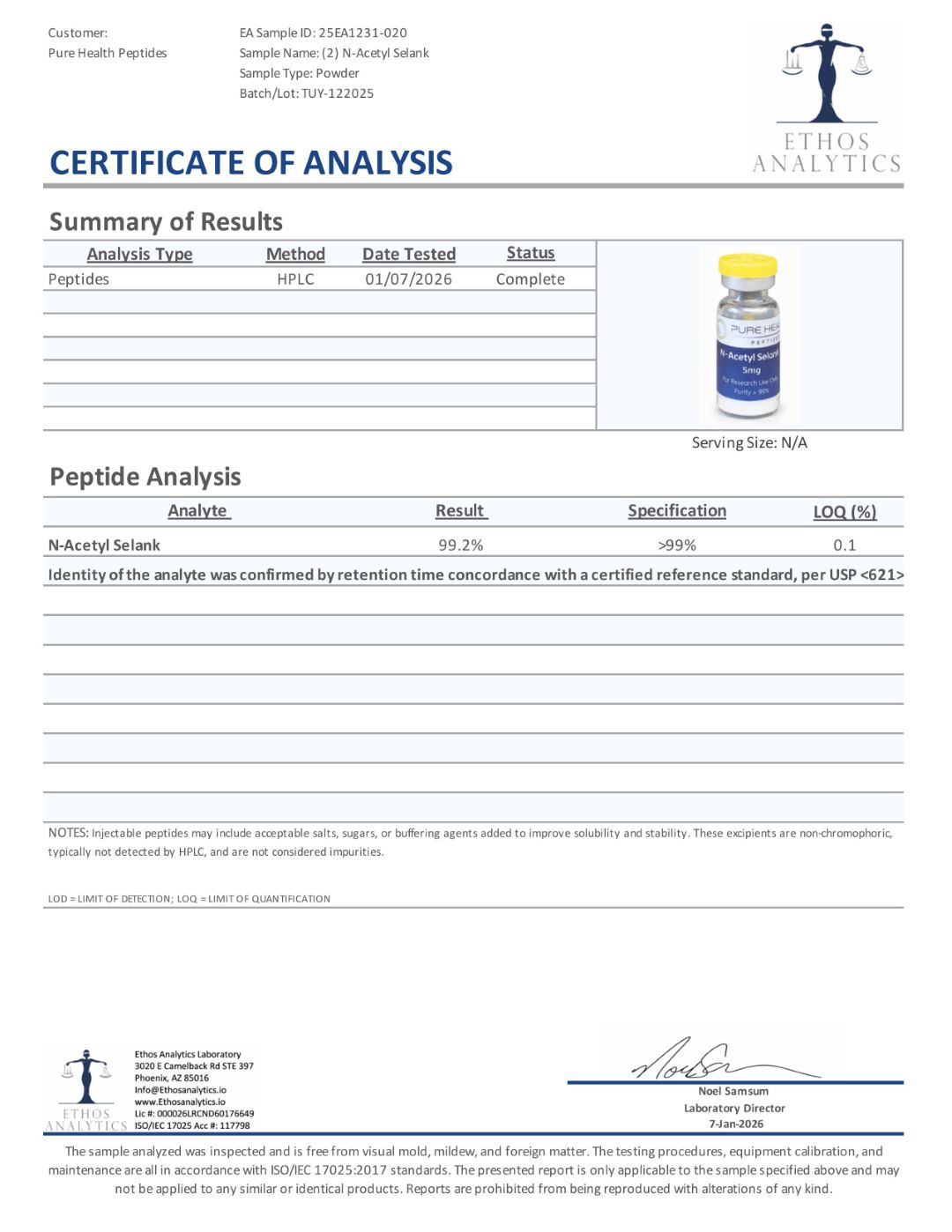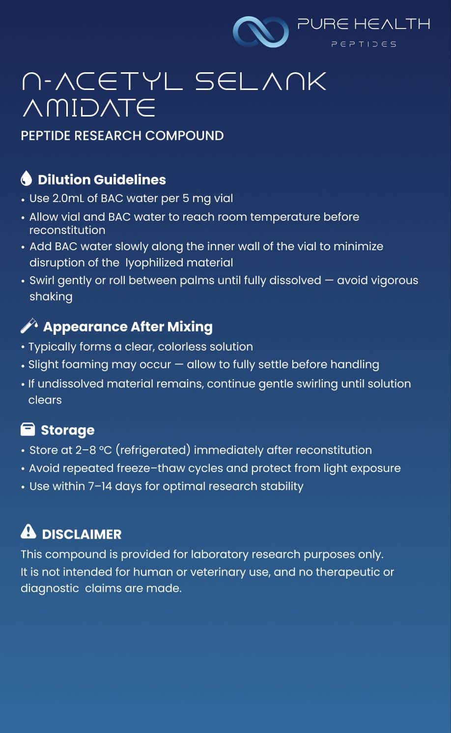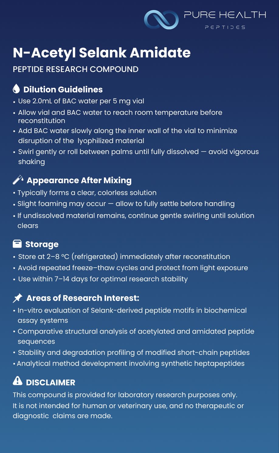 Supplied as a lyophilized powder, N-Acetyl Selank Amidate is intended exclusively for controlled in-vitro laboratory research conducted by qualified professionals.