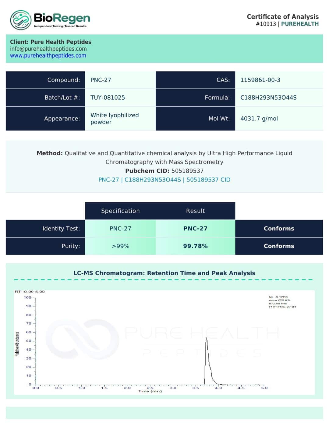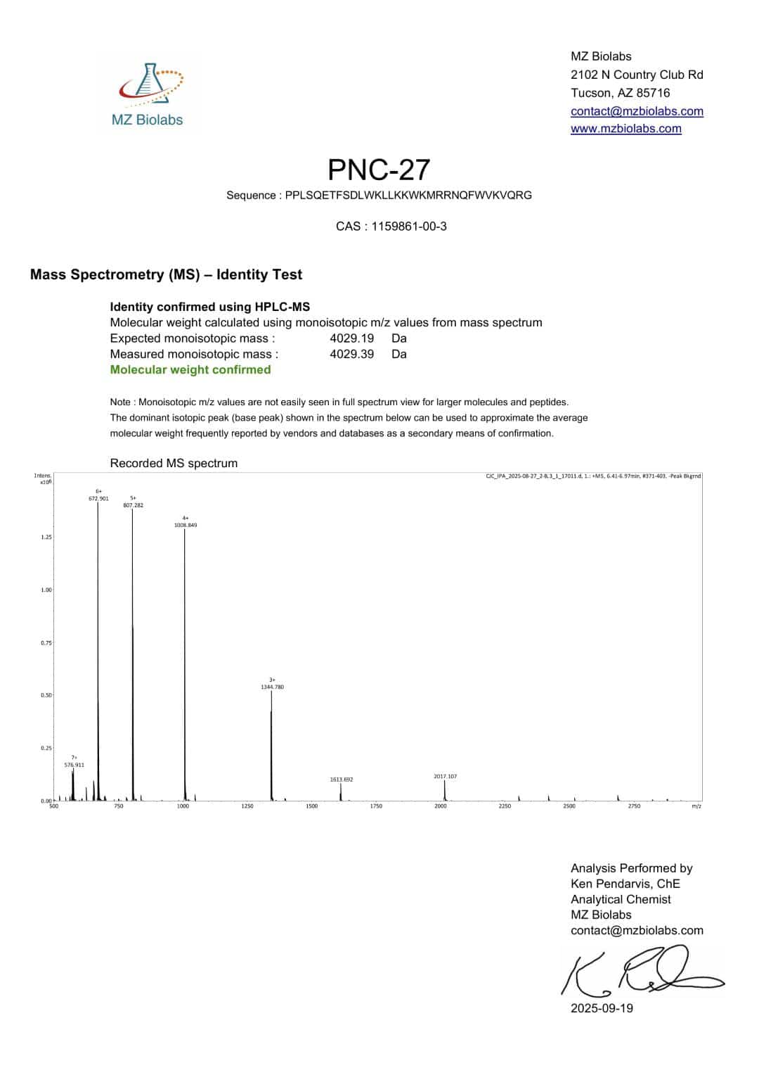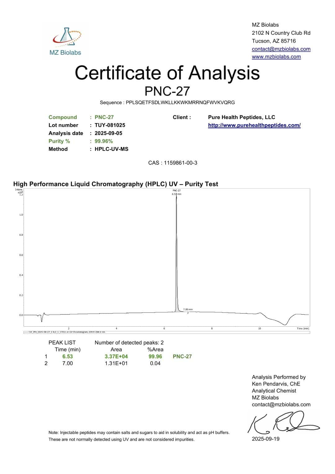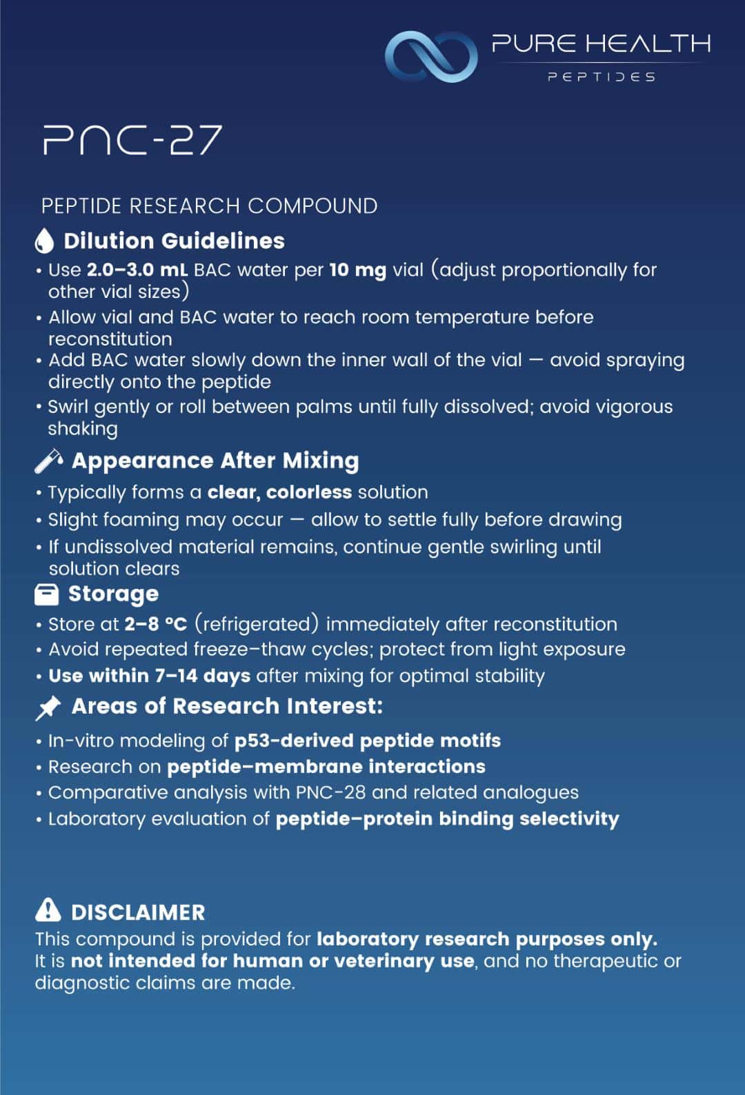 PNC-27 is a synthetic peptide containing a p53 tumor suppressor protein fragment linked to a membrane-disrupting domain. It is supplied in lyophilized powder form to ensure high purity and stability. PNC-27 is intended strictly for controlled in-vitro laboratory research by qualified professionals. It is not approved for human or veterinary use.