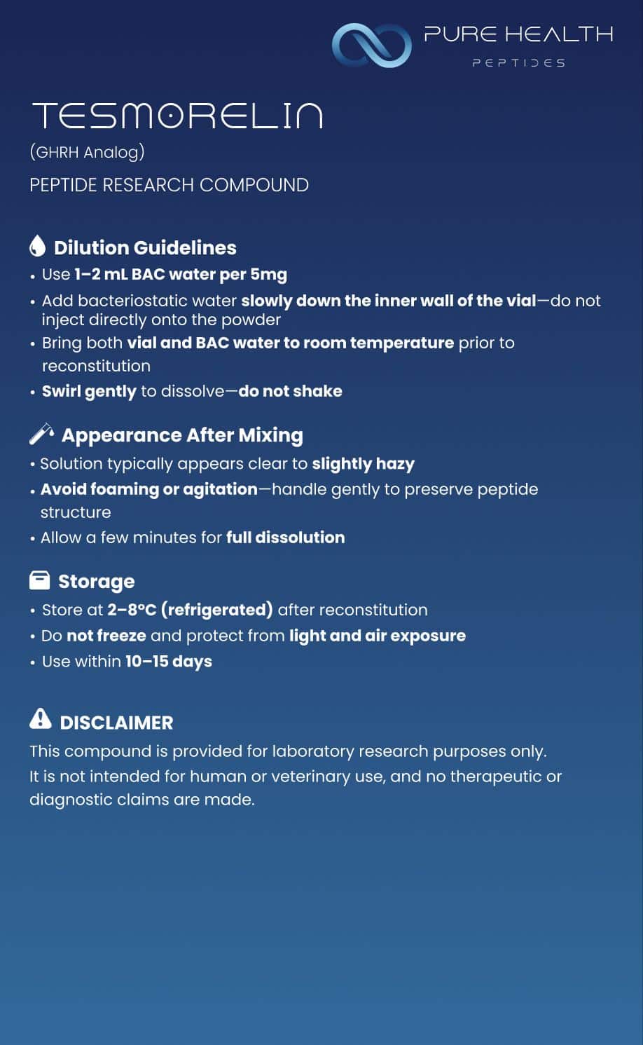 This product is not a drug, food, cosmetic, or dietary supplement and has not been evaluated by the FDA. It is strictly intended for in vitro research by qualified professionals. Any use in humans or animals is strictly prohibited and may violate federal, state, or local laws, including the Federal Food, Drug, and Cosmetic Act. No therapeutic or diagnostic application is implied or permitted. The purchaser assumes all responsibility for compliance with applicable regulations. By purchasing this product, the buyer represents and warrants that it will be used solely for in vitro research purposes and acknowledges that Pure Health Peptides maintains internal policies intended to support research-use-only sales.