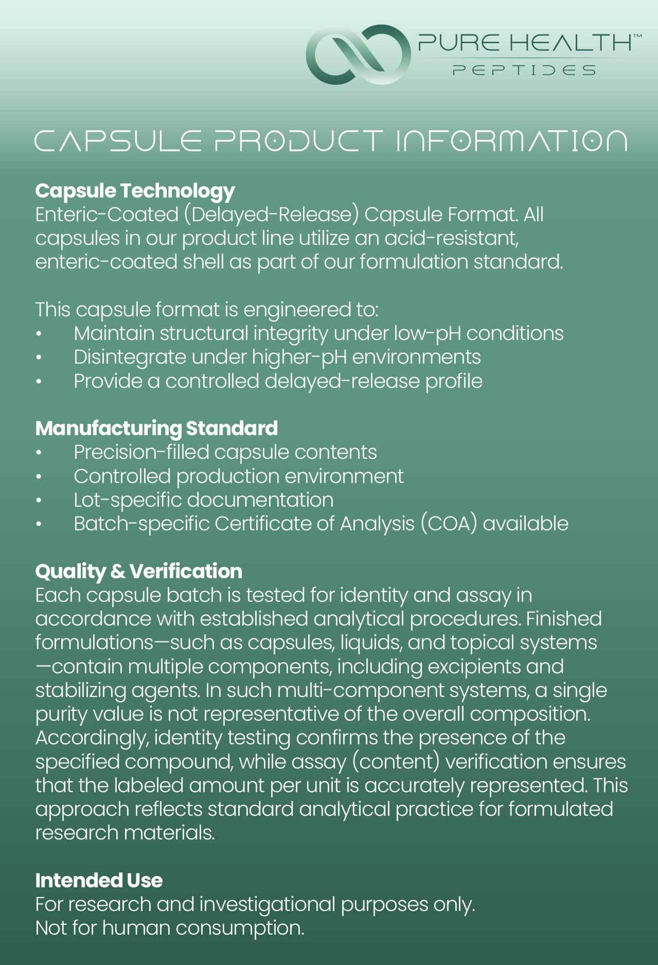 • Analytical Approach to Finished Formulations: Purity is a metric used for isolated raw materials, such as lyophilized peptide powders. Finished formulations—such as capsules, liquids, and topicals—contain multiple components, including excipients and stabilizers. In these systems, a single purity value does not accurately represent the overall composition. Instead, identity and assay (content) are reported on the COA to confirm the presence of the correct compound and to verify that the labeled amount per unit is accurate. This approach reflects standard analytical practice and provides more meaningful information for research applications.