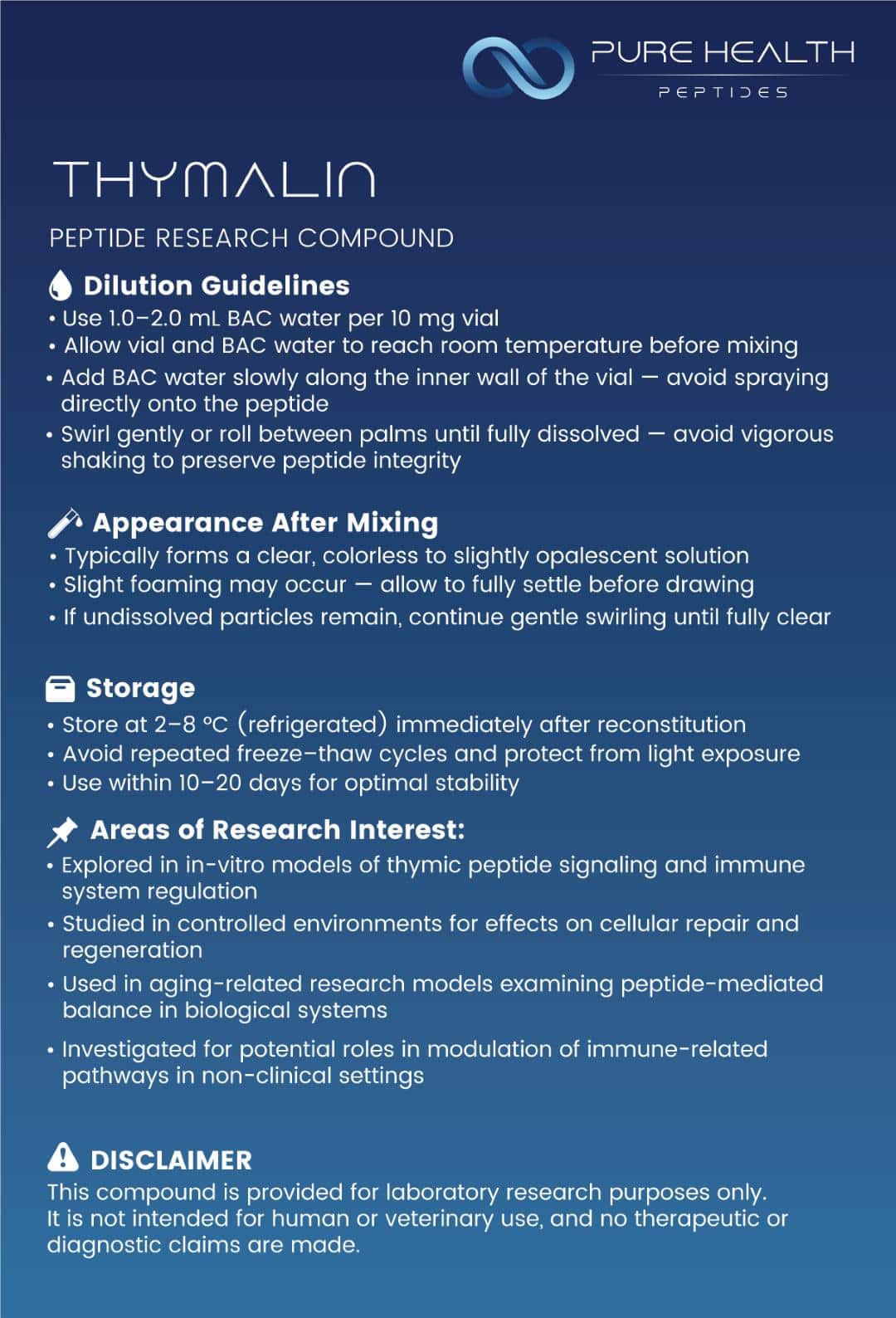 Thymalin is FOR RESEARCH USE ONLY. It is not intended for human or veterinary use. This product has not been evaluated by the FDA. Any misuse of this product may violate federal, state, or local laws. By purchasing this product, the buyer represents and warrants that it will be used only for in vitro research purposes.